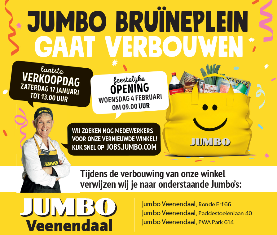 Jumbo Huibers Bruïneplein vindt u in het hart van Veenendaal-Zuid aan de Dr. Slotemaker de Bruïnestraat 20. Welkom in onze winkel waar we elke dag er alles aan doen om u een winkel te bieden met heerlijke producten en lage prijzen waar u gezellig én vlot boodschappen doet! U kunt online bestellen via jumbo.com en dit laten thuisbezorgen of zelf oppikken in onze drive-through in de parkeergarage van Jumbo P.W.A. Park.